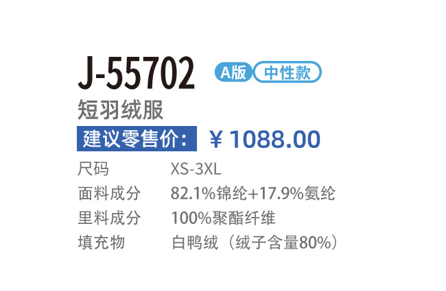 面料:82.1%锦纶+17.9%氨纶;里料:100%聚酯纤维;填充物:鸭绒(绒子含量80%)