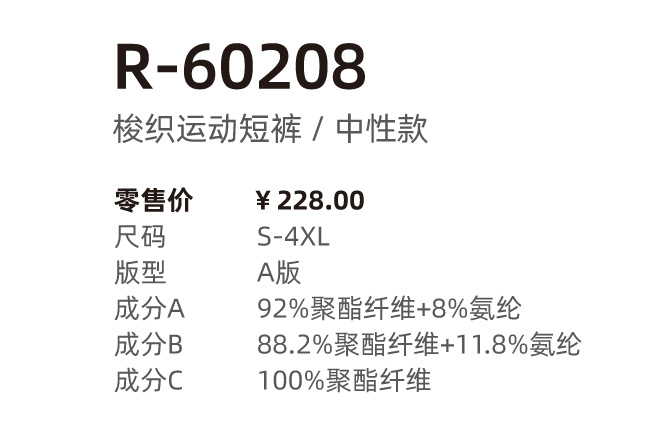 面料A:92%聚酯纤维+8%氨纶;面料B:88.2%聚酯纤维+11.8%氨纶;面料C:100%聚酯纤维